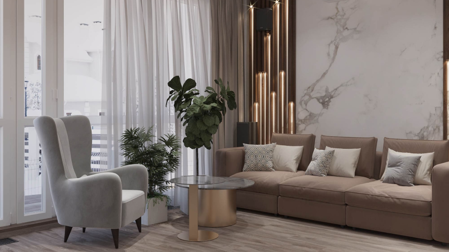 Заказчики этого проекта не боялись темных тонов и сложных текстур. Поэтому мы использовали сложные сочетания камня, темного дерева и контрастных элементов.